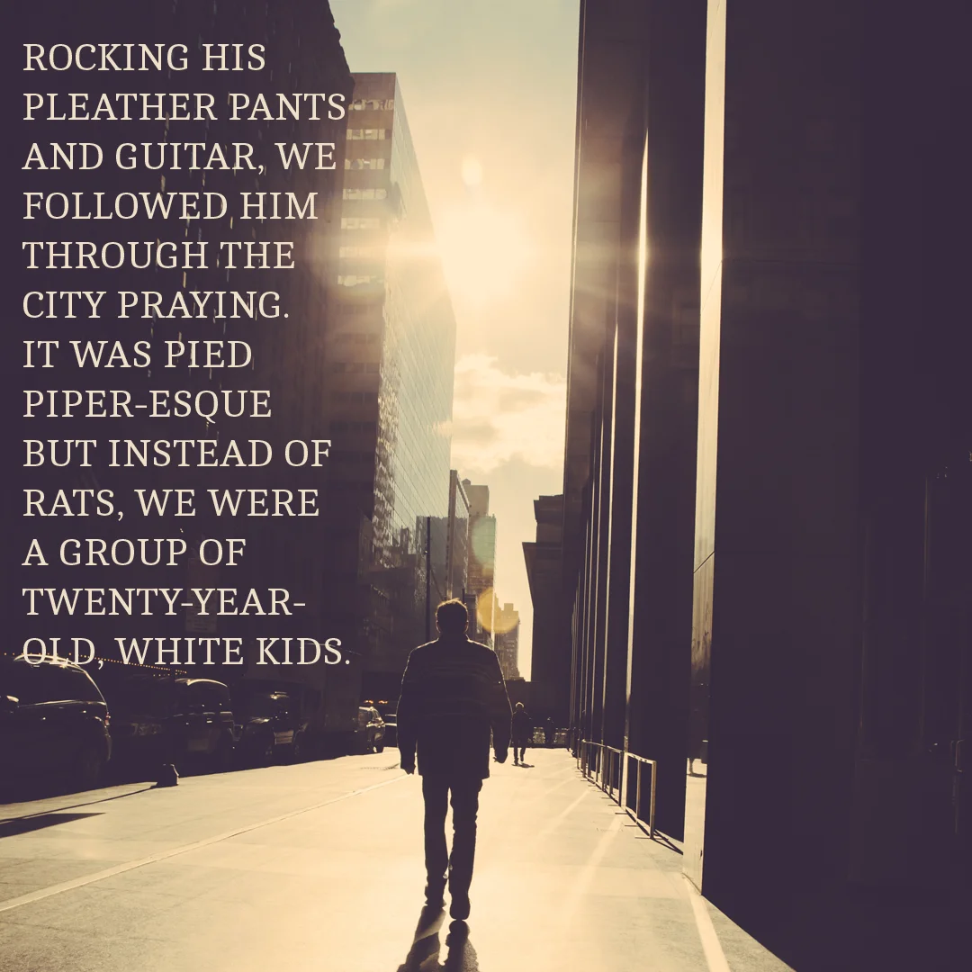 Frank grew up in the church and saw countless demonstrations of the power of prayer. One time he fearlessly lead a group of us downtown. Rocking his pleather pants and guitar, we followed him through the city praying. It was Pied Piper-esque but instead of rats, we were a group of twenty-year-old, white kids.